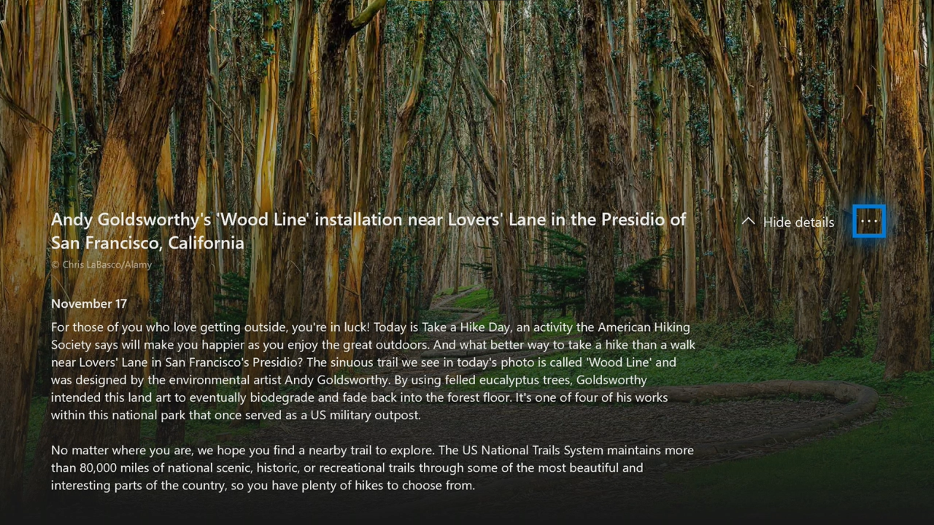 There’s no daily refresh (yet, but I’d wager that’s coming soon). Still, it’s the fastest and easiest way I’ve found by far to get your favorite image behind your Xbox games, apps, and other home screen widgets. No more awkwardly shuttling images on a USB thumb drive, digging through the system settings, and traversing file trees to find and select images. Just launch the Xbox app and press X to view the image of the day.