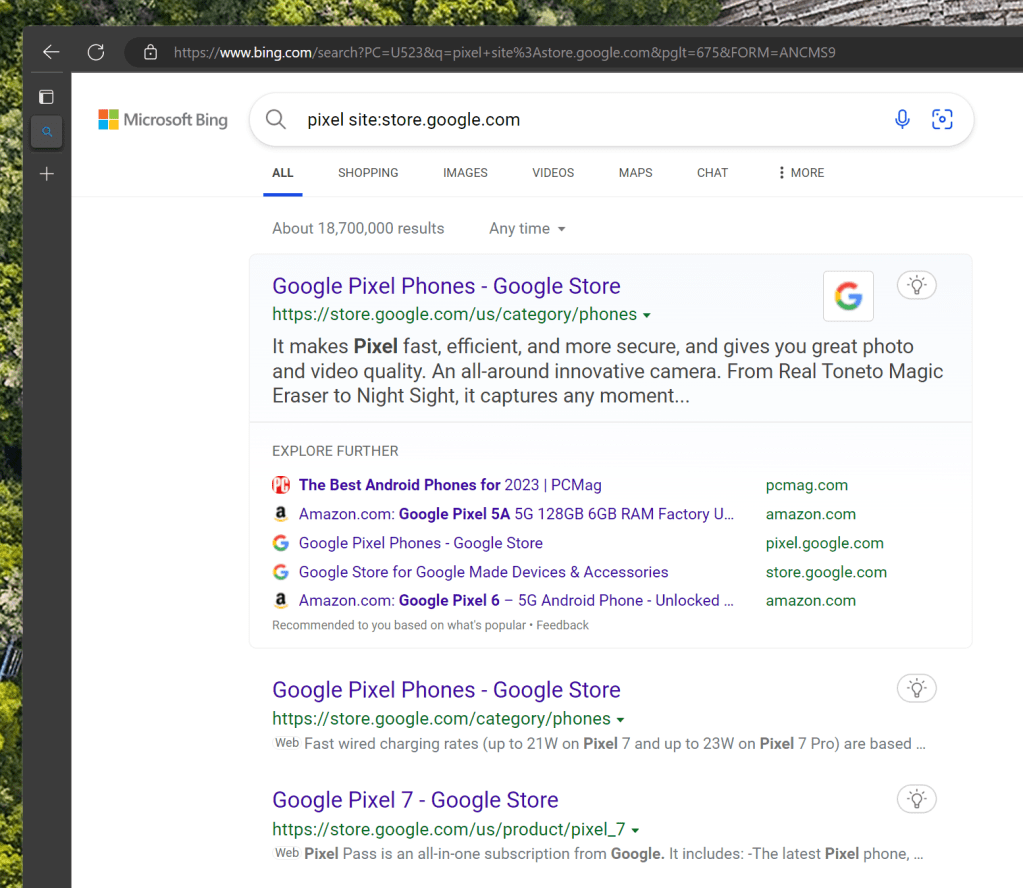 What if you want to restrict your search to a specific site? Well, you may know that most search engines support this by using special flags and keywords followed by the domain you want to search. For instance, searching for pixel site:store.google.com tells the search engine to restrict its results to Google’s store. So, you’ll get results that include Google’s own line of phones and gadgets instead of, say, more general information about monitors, cameras, and screen resolution from around the entirety of the web.